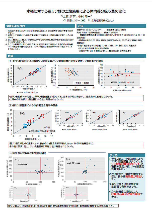 今回、弊社は2023年~2025年に取り組んできた亜リン酸の研究成果を発表いたしました。 亜リン酸は「植物に吸収されやすく即効性の高いリン酸肥料」であると同時に、「病害抵抗性を高める」という特長を持つユニークな資材です。農業分野では肥料として、工業分野では還元剤として幅広く利用されており、近年特に注目を集めています。亜リン酸を活用することで、根張りや収量改善に加え、病害予防まで期待できる点が大きな魅力です。