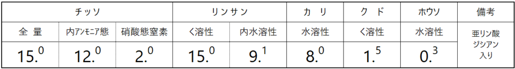 この肥料は、硝酸化成抑制効果を持つジシアンジアミドが入っており、肥効のおだやかな化成肥料です。